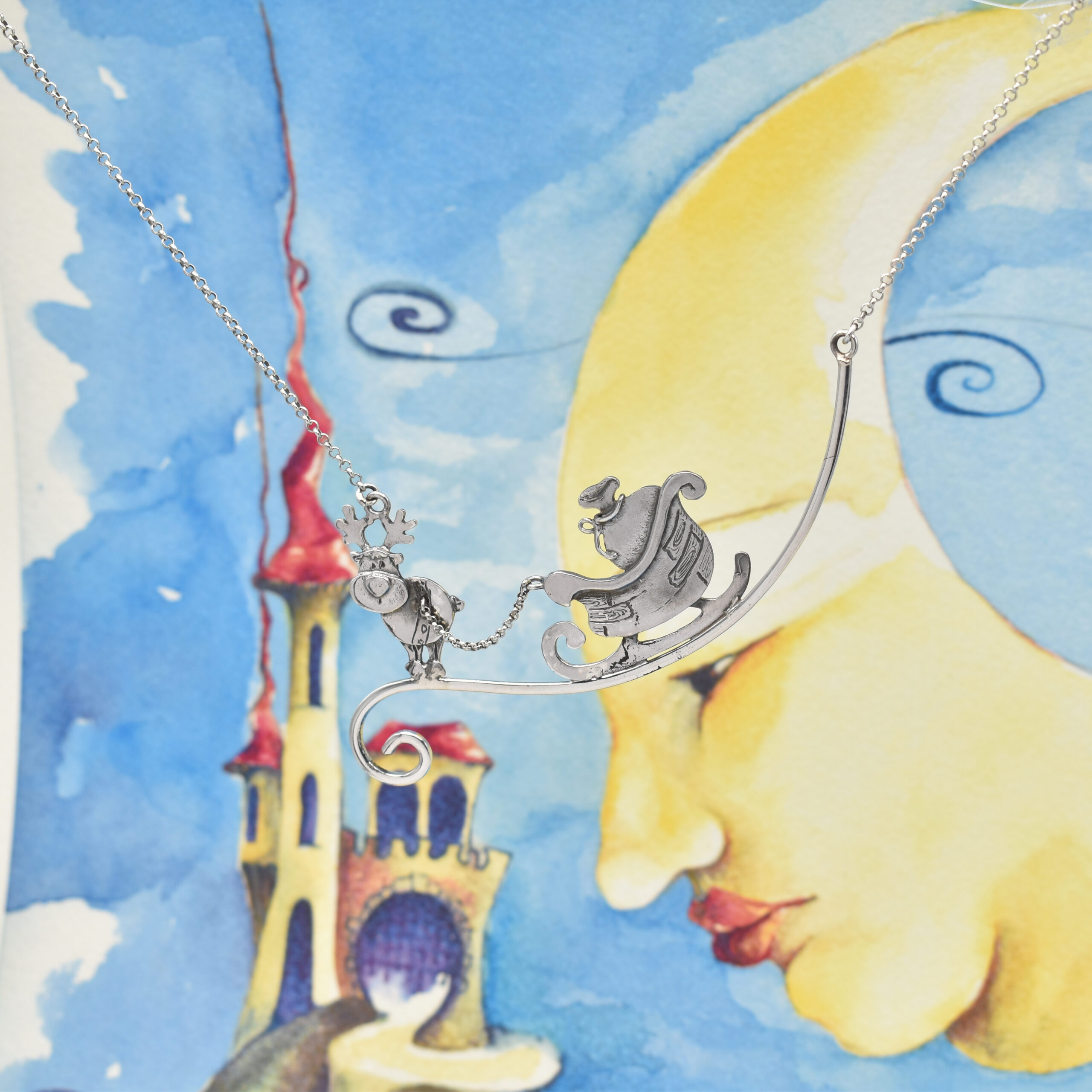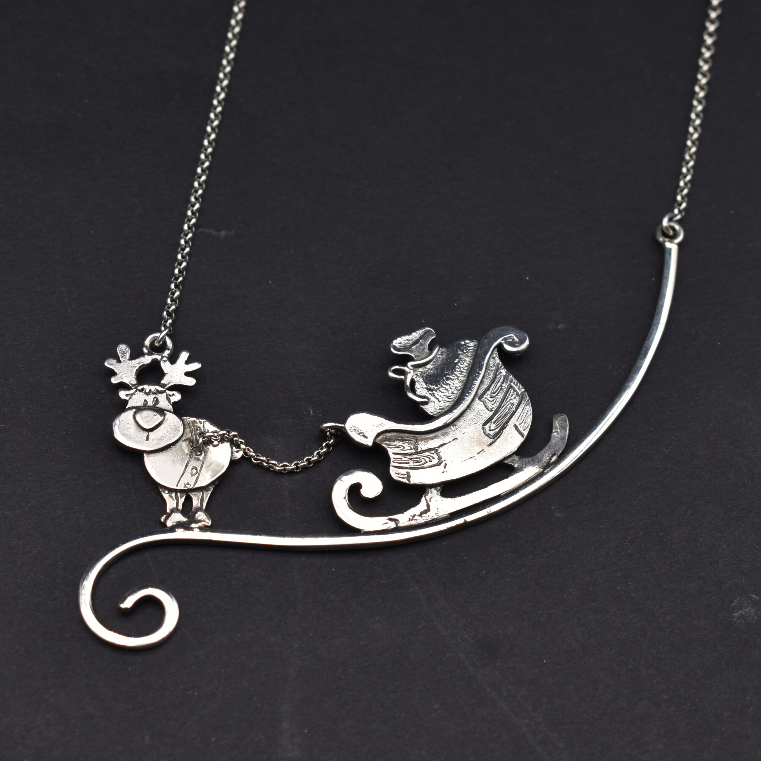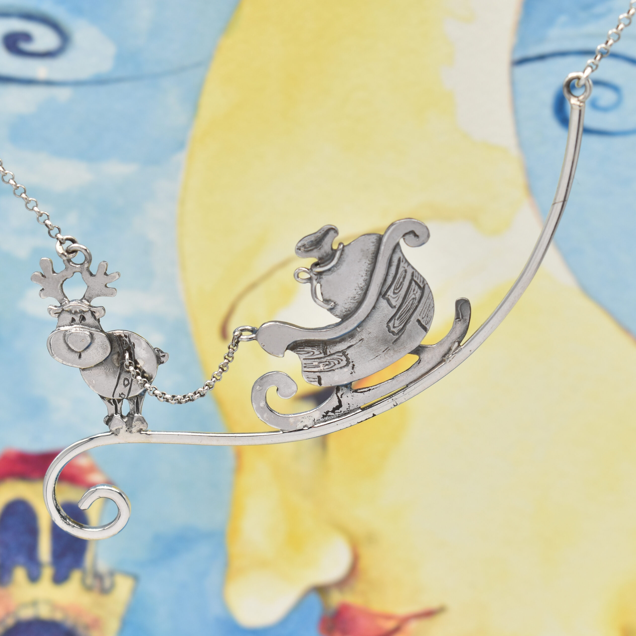 Collana renna di Natale e slitta di Babbo Natale disegnata e realizzata nel nostro laboratorio di Siena in argento 925. Made in Italy