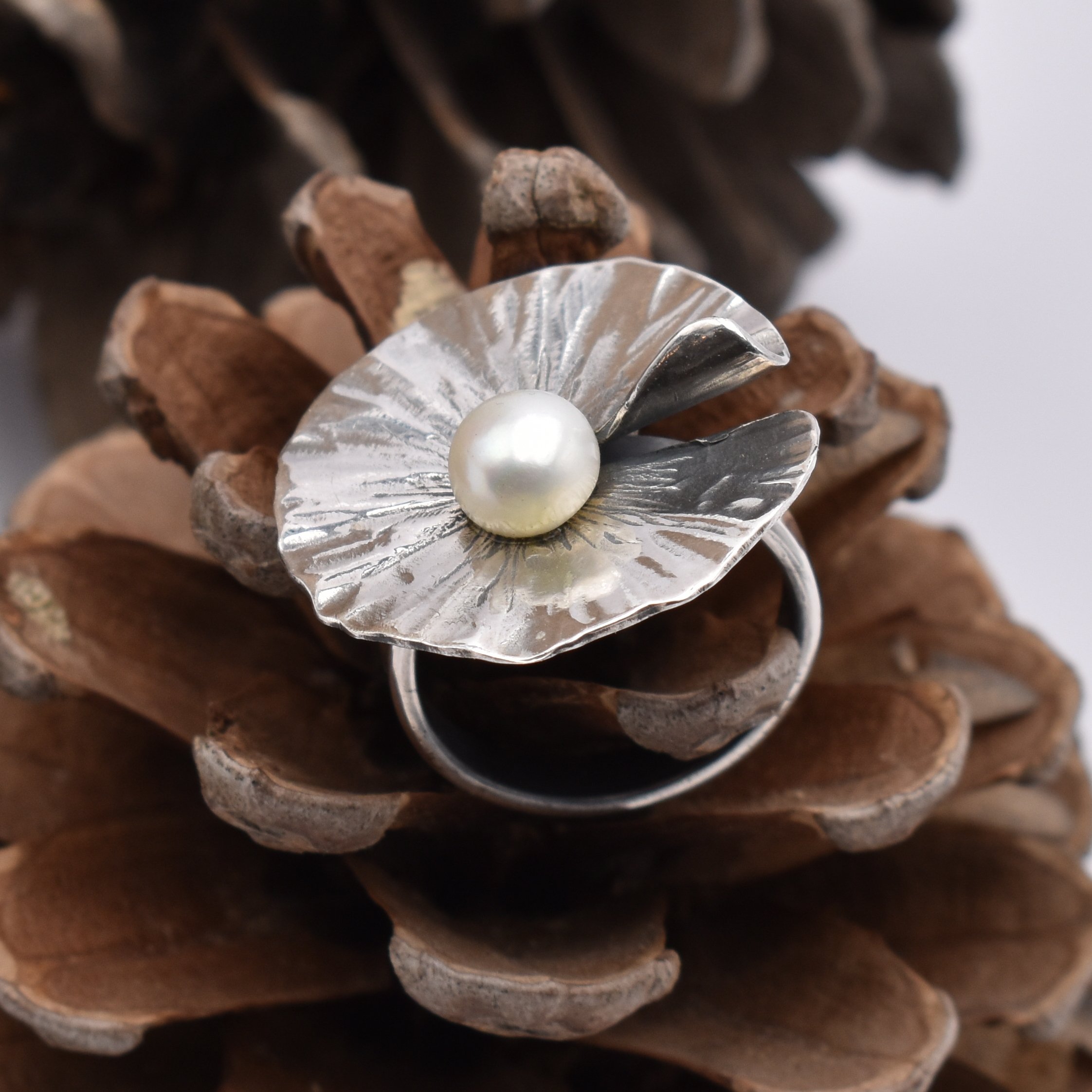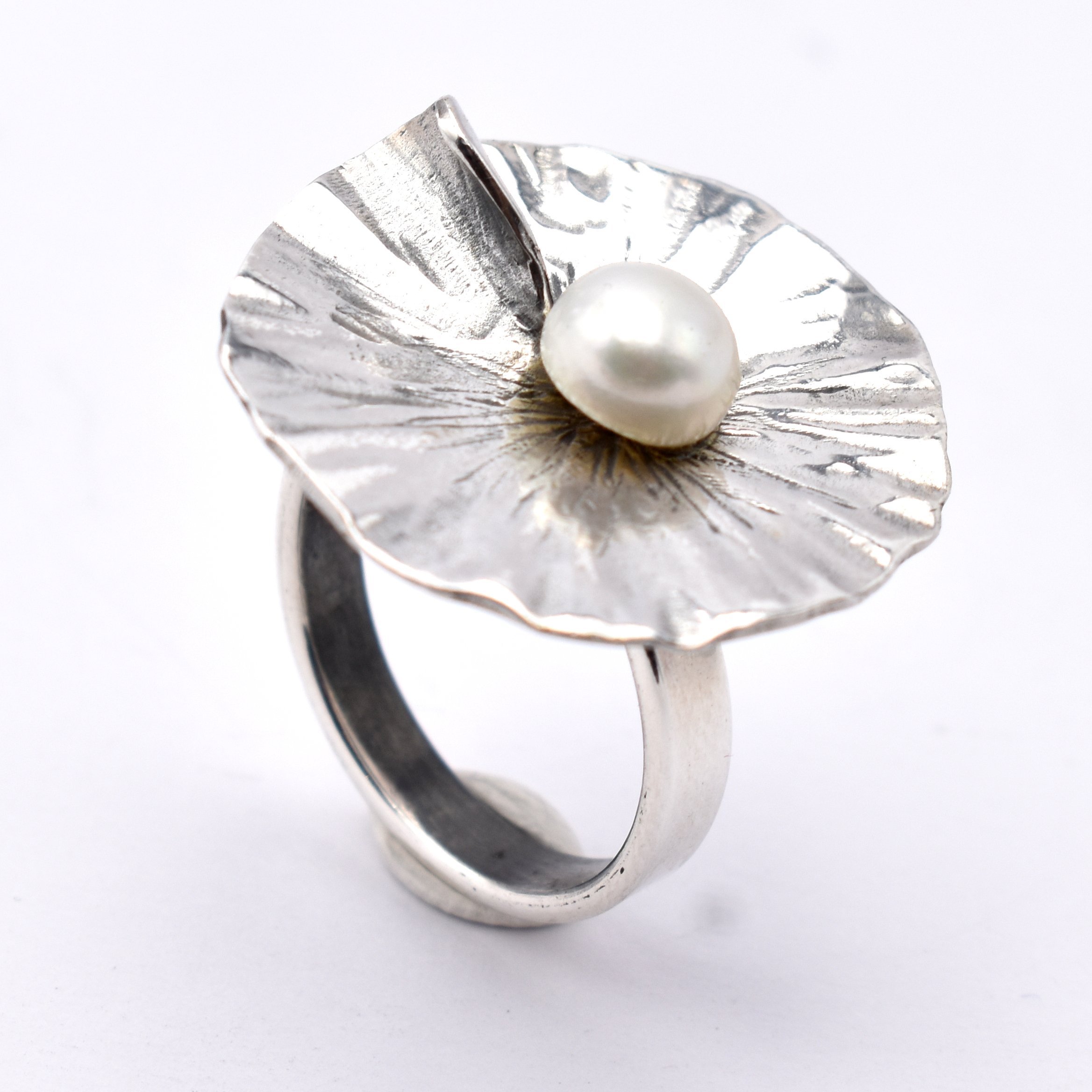 Anello Foglia di loto argento 925 e perla disegnato e realizzato dai maestri orafi nel laboratorio Il Galeone.