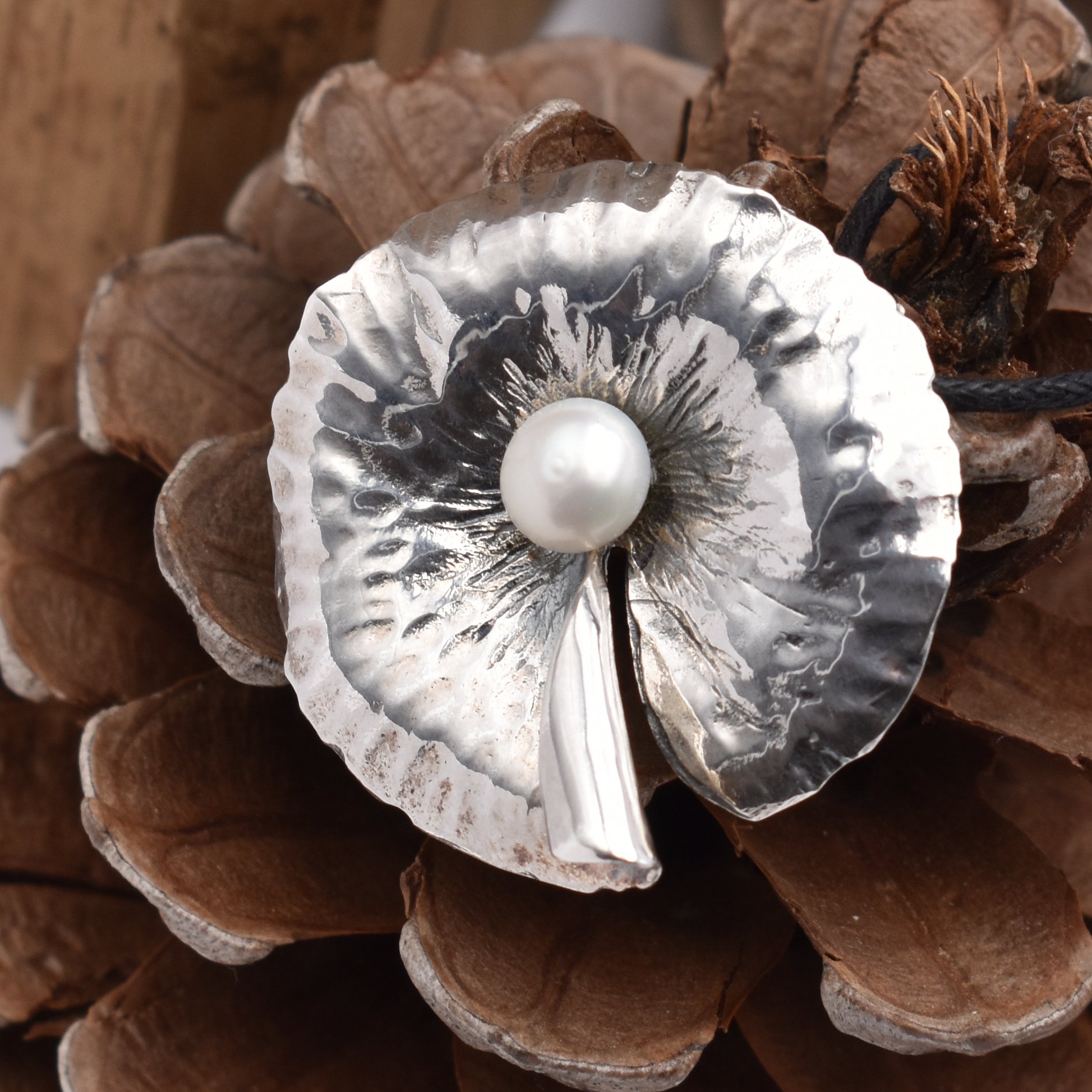 Pendente Foglia di loto argento 925 e perla di acqua dolce disegnato e realizzato dai maestri orafi nel laboratorio Il Galeone.