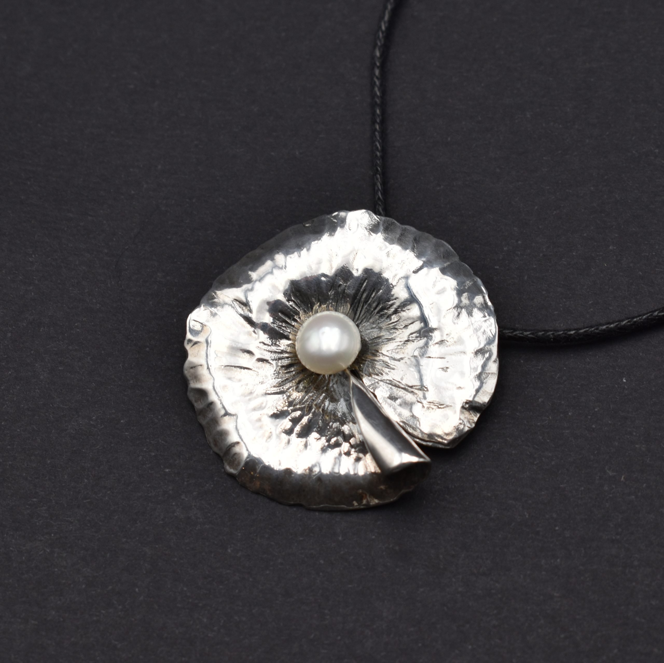 Pendente Foglia di loto argento 925 e perla disegnato e realizzato dai maestri orafi nel laboratorio Il Galeone.