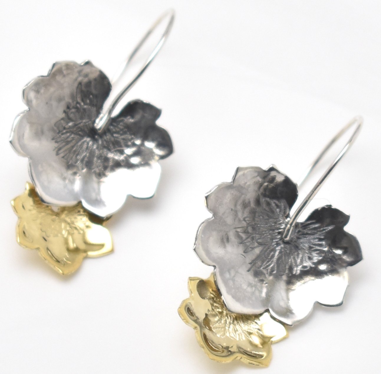 ogni orecchino è formato da 2 foglie: quella superiore più grande rodiata e quella inferiore più piccola dorata